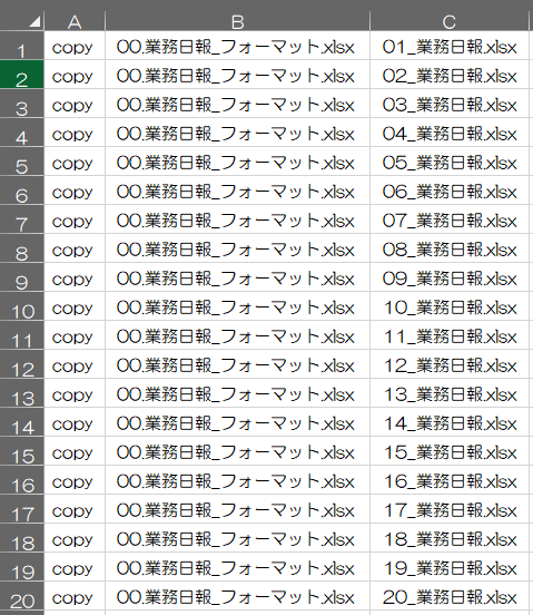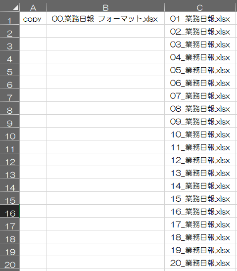 次に、C列に1行ずつ作成したいファイル名称を入力します!