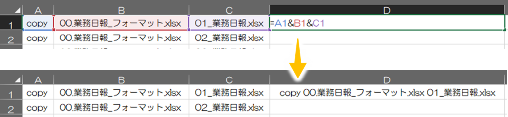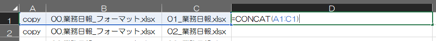 次に、D1セルに『=A1&B1&C1』と数式を入力してください!
