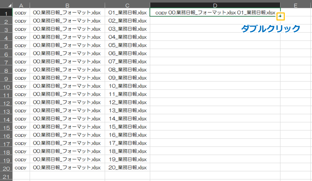 D1セルのフィルハンドルをダブルクリックして他の行にも展開します!