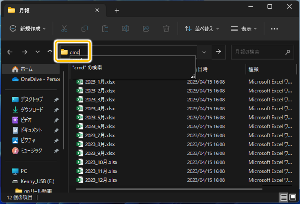 開いたらアドレスバーの部分に『cmd』と入力して『Enter』キーを押します!