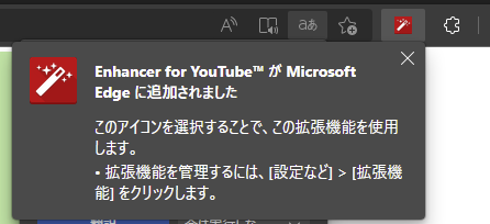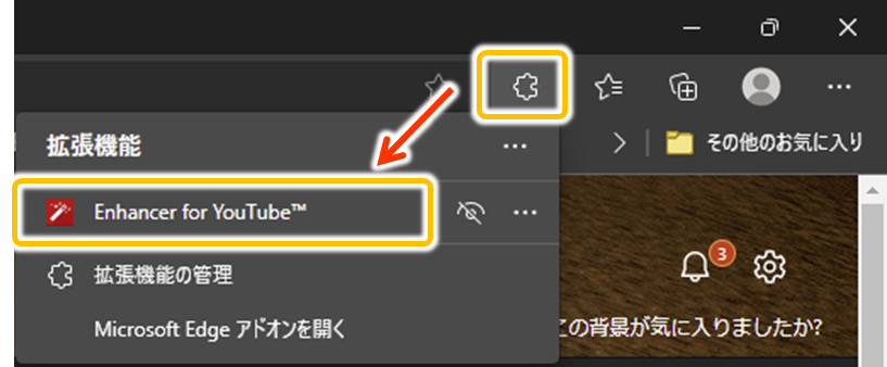 追加された拡張機能の設定を開きます!拡張機能のアイコン(パズルのピースみたいなアイコン)をクリックして『Enhancer for Youtube』を開きます!